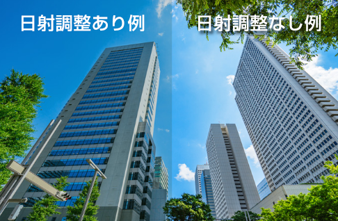 日射調整タイプはガラスの透明感や採光性を保ちつつ、高い日射調整効果を発揮し、建物の省エネ対策に大きく貢献します。窓ガラスに貼るだけで夏場の冷房効率をアップさせ、省エネ化を促進します。