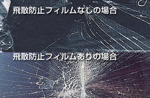 飛散防止フィルムを施工した場合、台風や強風などの飛来物で窓ガラスが破損した場合でも、破片が飛び散ることなく、怪我などの防止と、室内への雨などの降り込み防止できます。また、侵入に時間がかかるため、防犯効果も期待できます。